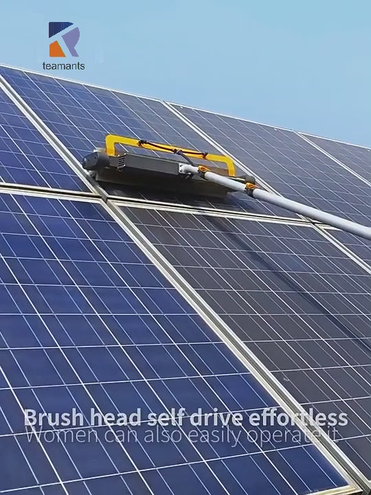 A professional electric cleaning tool with a telescopic pole (7.5 m) designed for long-distance cleaning of solar panels from the ground.